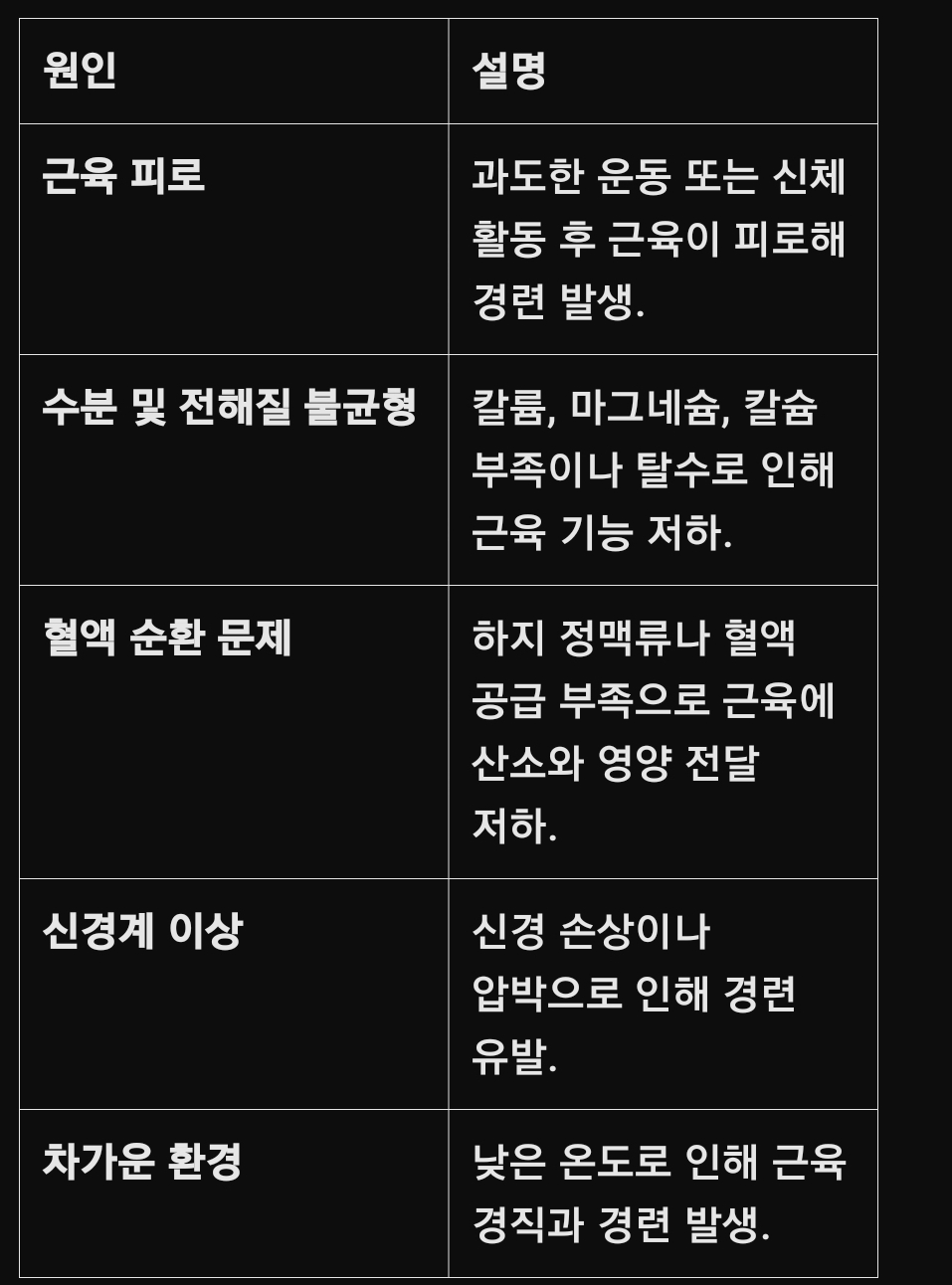 차가운 환경: 낮은 온도에서 근육이 경직되어 경련 발생.