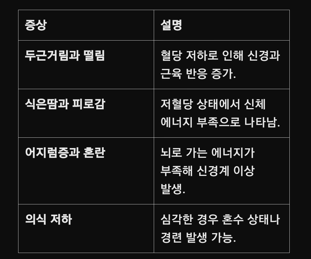 저혈당증은 초기 증상과 중증 증상으로 나뉜다.