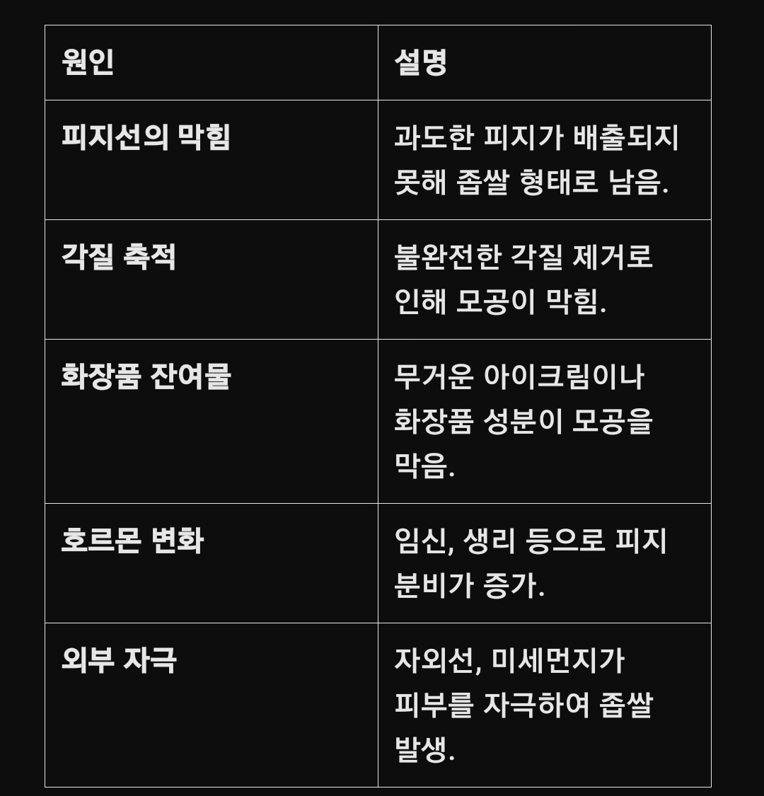 불완전한 각질 제거로 인해 각질이 모공을 막아 좁쌀 형태가 생깁니다.