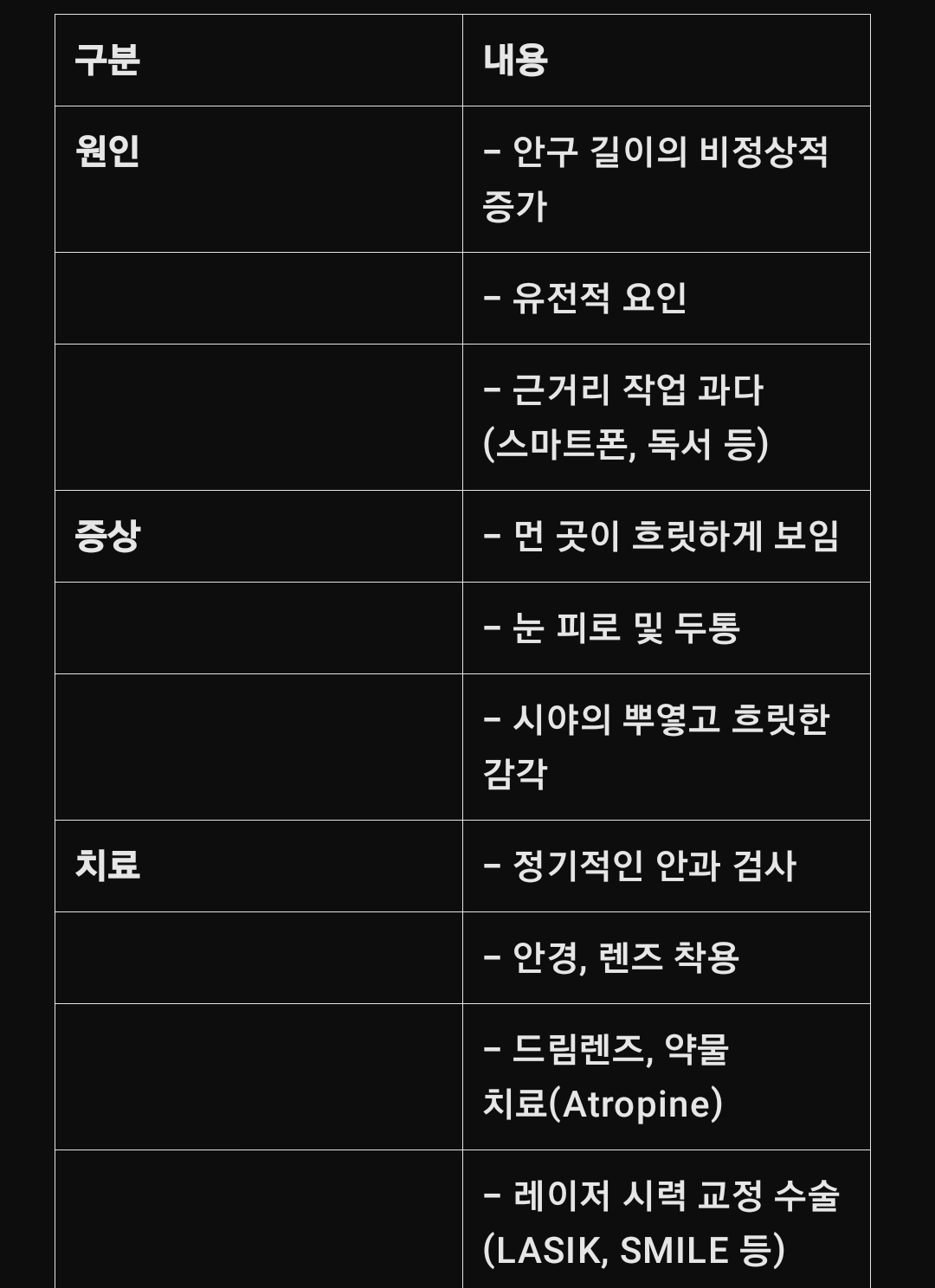 이처럼 근시는 조기 발견과 적극적인 치료가 중요합니다. 정기적인 시력 검사, 적절한 교정기구 사용, 생활습관 개선으로 건강한 시력을 유지하세요!