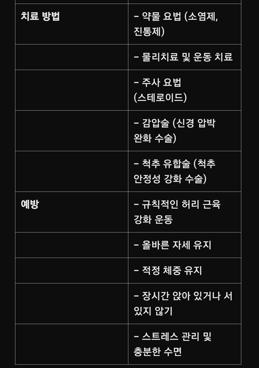 운동 치료: 허리와 다리 근육을 강화하기 위한 맞춤형 운동이 제안되었습니다.