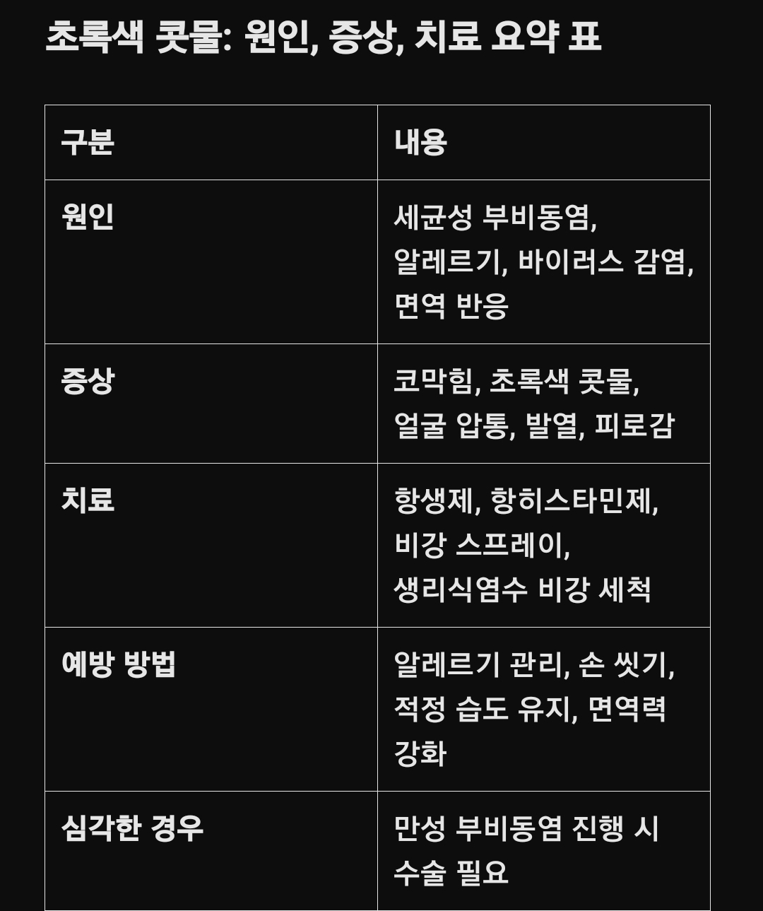 이처럼 초록색 콧물은 무시해서는 안 되는 신호입니다. 정확한 진단과 적절한 치료를 통해 건강을 회복할 수 있습니다.