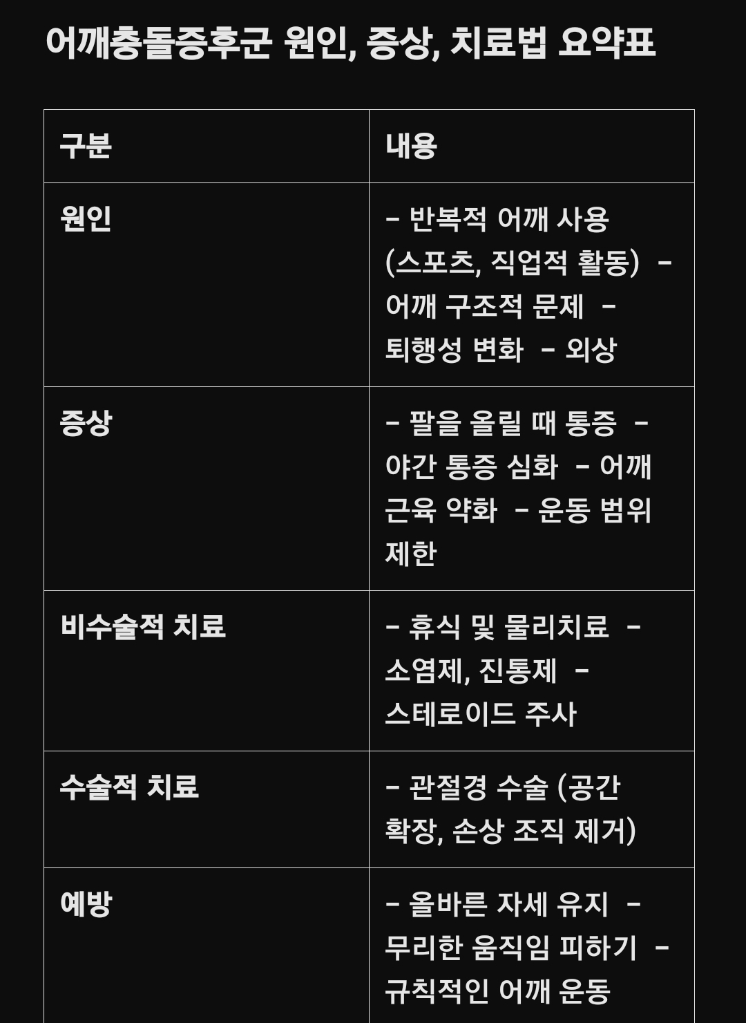 어깨충돌증후군은 적절한 관리와 예방법을 통해 극복할 수 있는 질환입니다. 자신의 몸이 보내는 신호를 무시하지 않고 초기에 적절히 대응하는 것이 무엇보다 중요합니다.