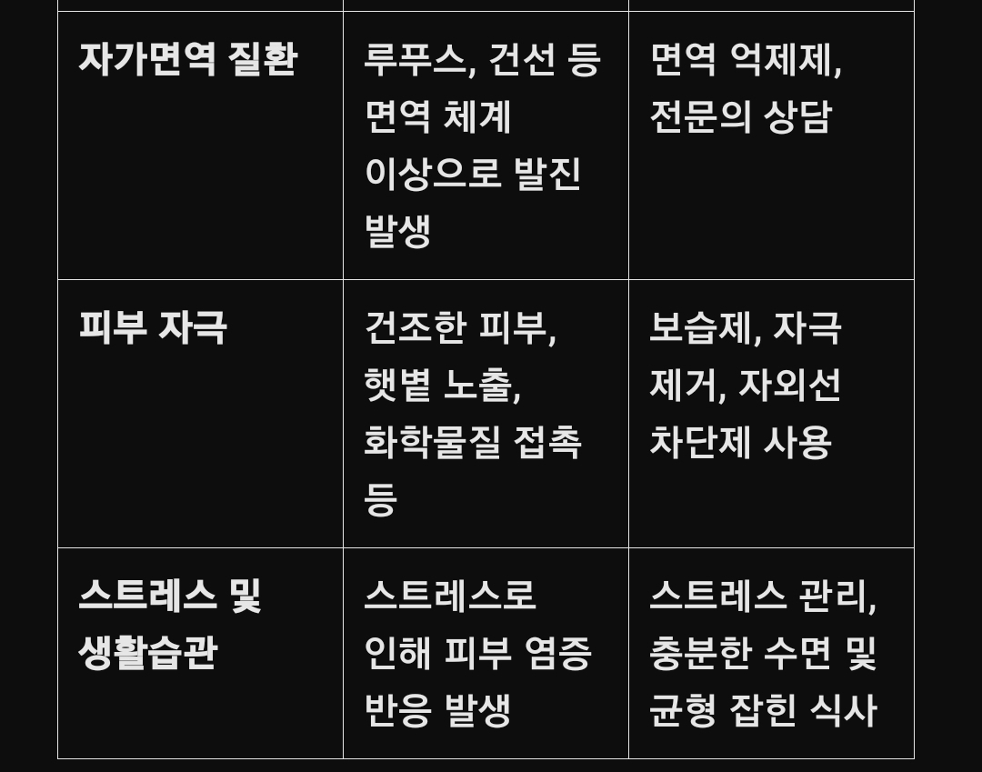 자극적인 환경(화학물질, 극한 온도 등)을 피하고, 피부에 자극을 줄 수 있는 행동을 줄이는 것이 중요합니다.