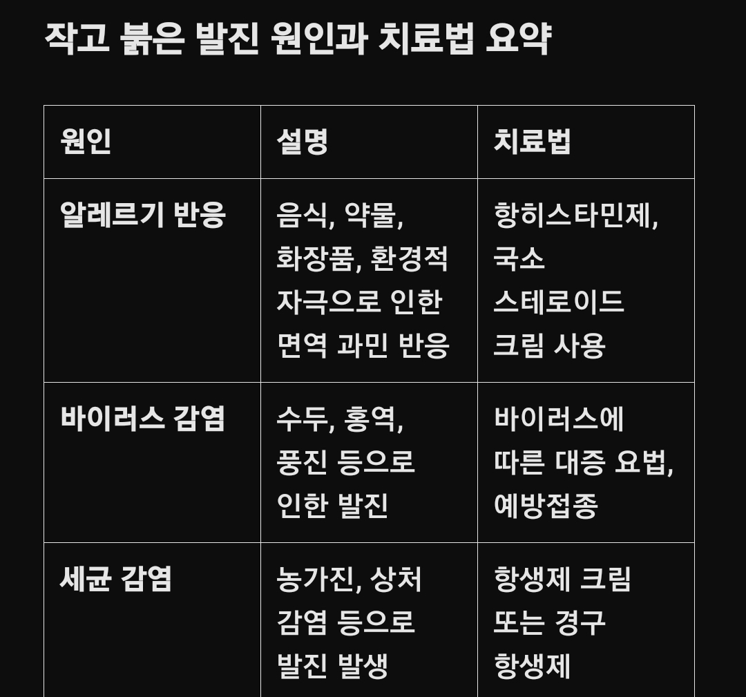 작고 붉은 발진은 단순한 피부 문제처럼 보일 수 있지만, 근본 원인을 정확히 파악하고 적절한 조치를 취하는 것이 건강을 지키는 열쇠입니다.