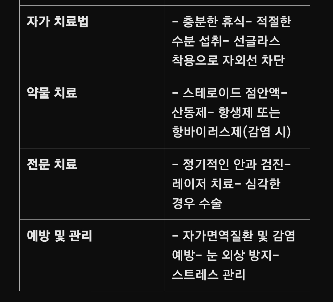 특히, 정기적인 안과 검진과 스테로이드 점안액 사용이 큰 도움이 되었습니다.
