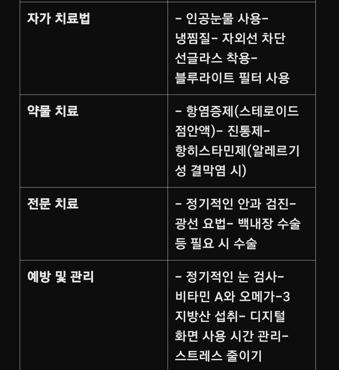 특히, 인공눈물과 선글라스 착용이 큰 도움이 되었으며,