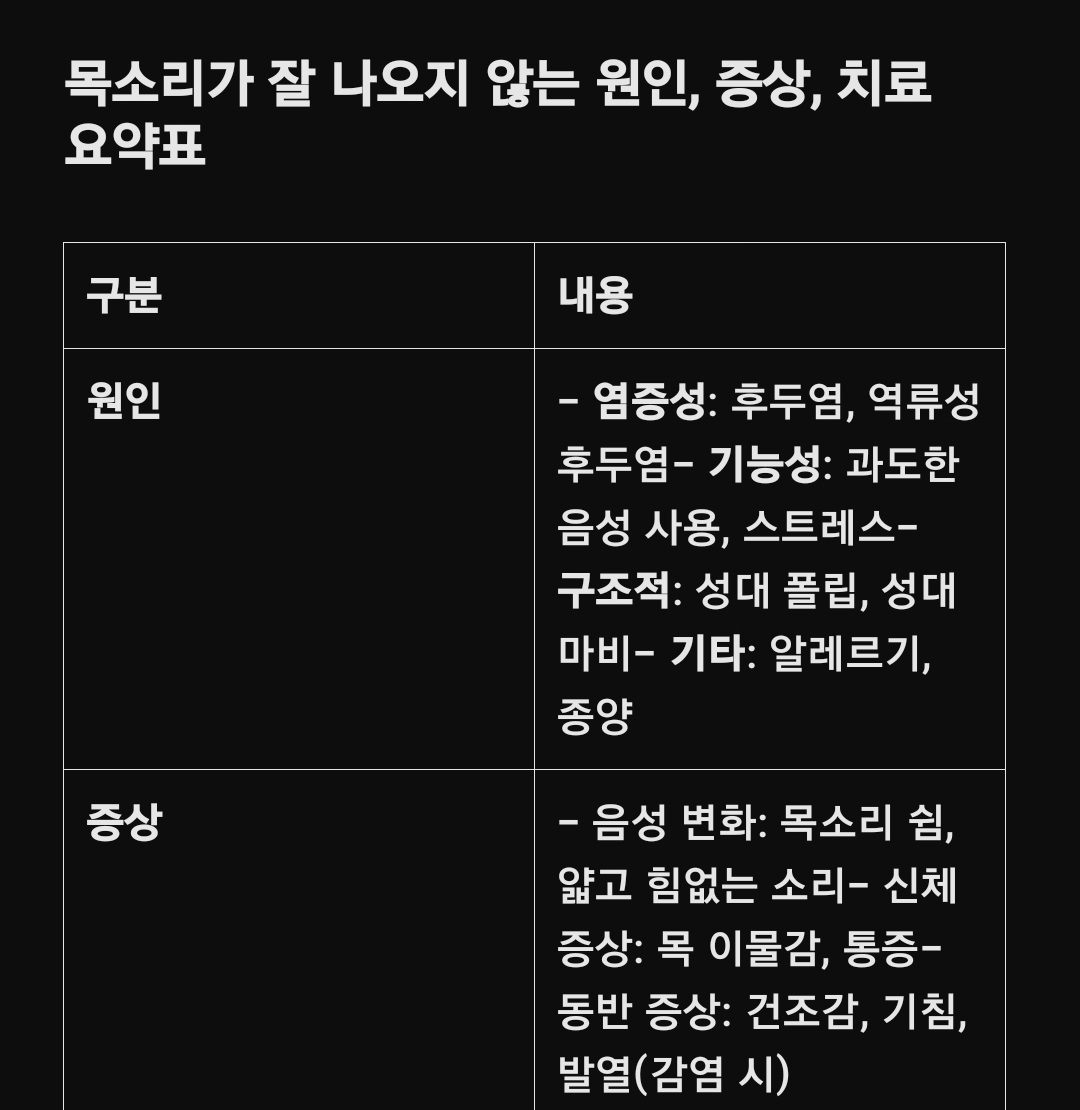 목소리가 잘 나오지 않거나 쉬는 상태를 의학적으로 성대 이상 또는 후두 질환으로 정의합니다.