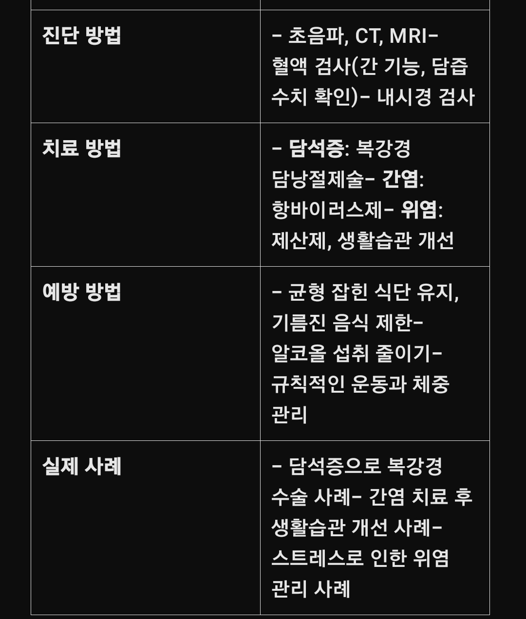 담석증: 담낭 내 결석으로 인해 담즙 흐름이 차단되며 극심한 복통이 발생합니다.