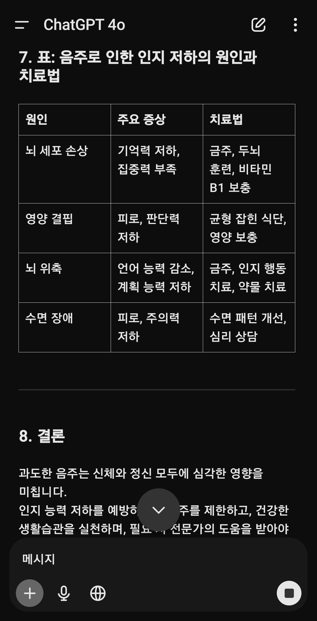 과도한 음주는 뇌 세포 손상, 기억력 저하, 집중력 저하 등 인지 기능 저하로 이어질 수 있습니다.