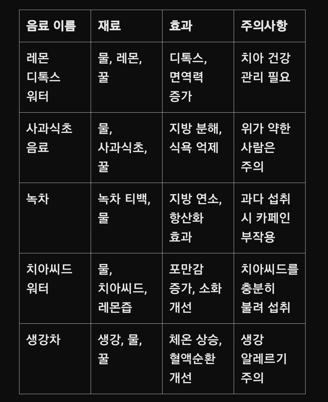 일부 음료는 체내 독소 제거를 도와 몸의 순환을 개선하고 건강을 증진시킵니다.