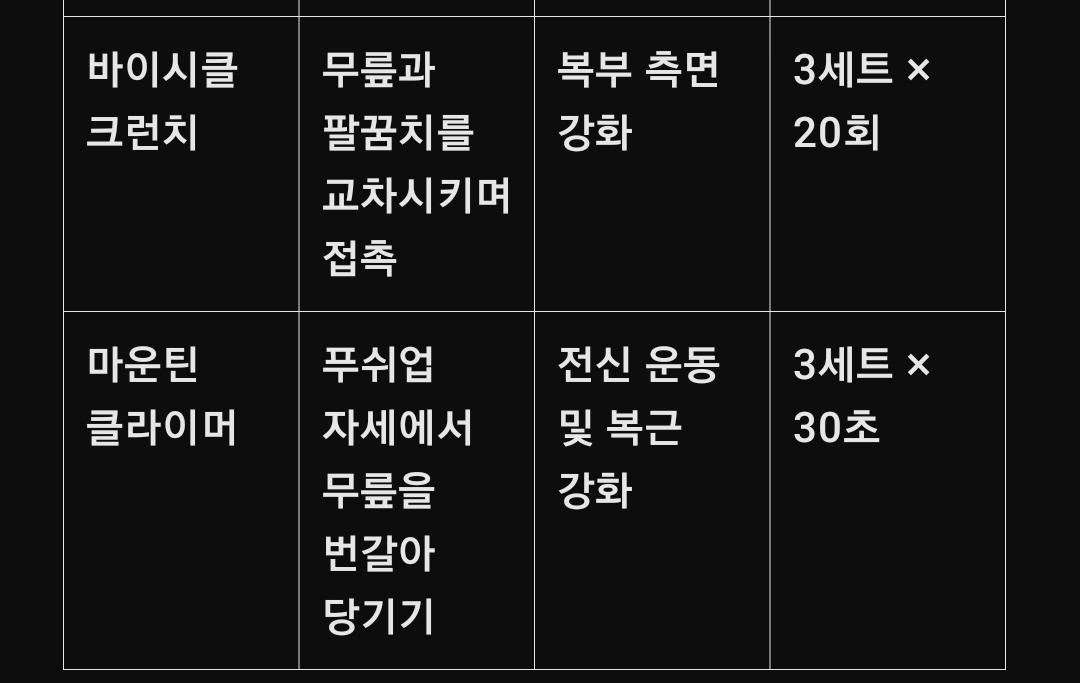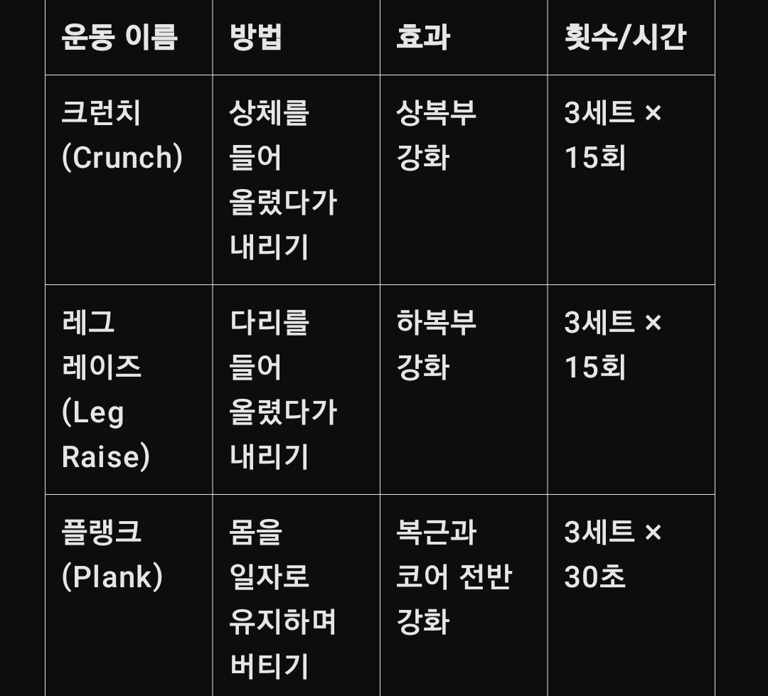 방법: 크런치와 플랭크를 위주로 하루 10~15분 운동.
