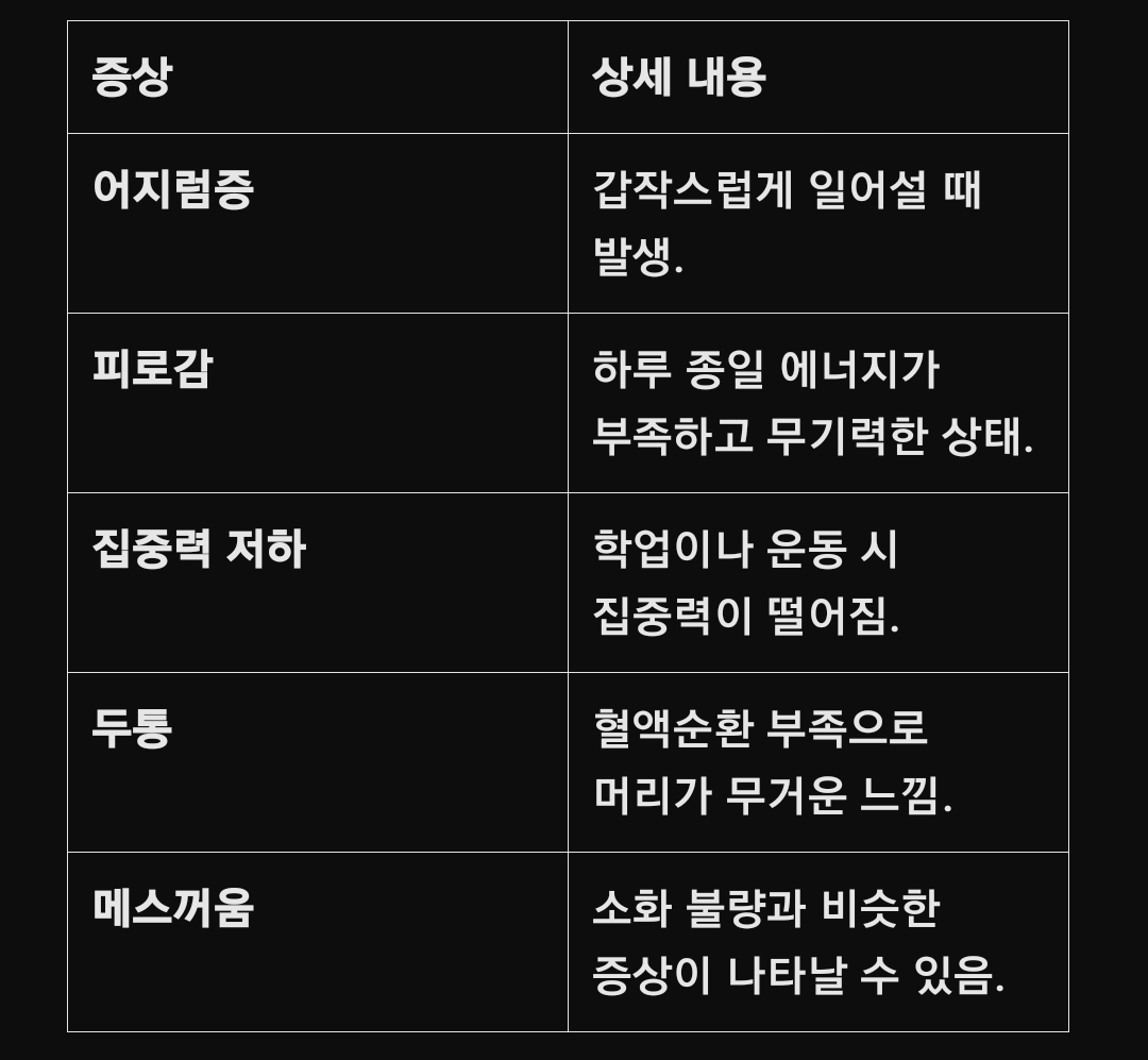 증상: 기력 저하, 어지럼증, 심리적 불안.
