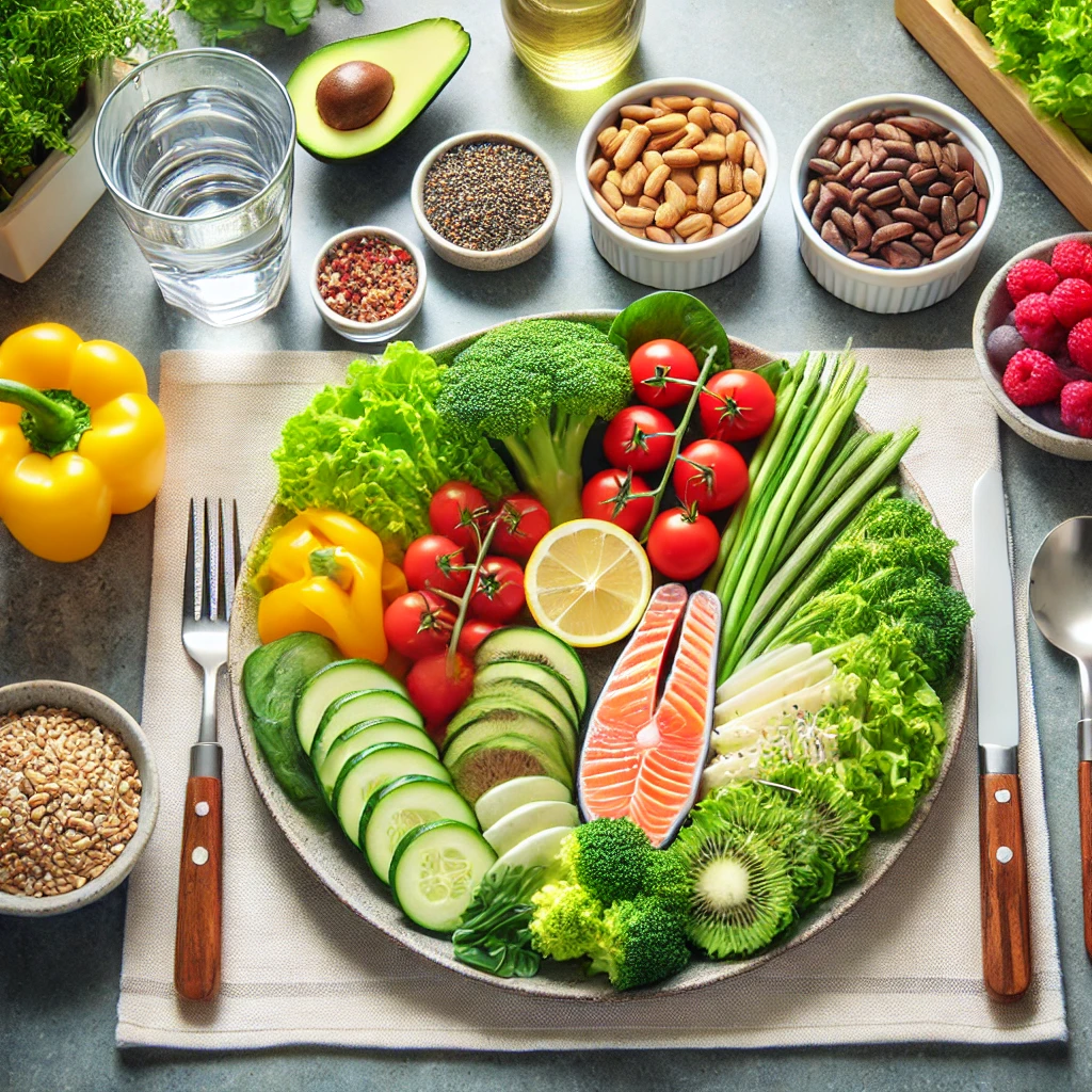 신선한 채소, 과일, 통곡물 중심의 식사.