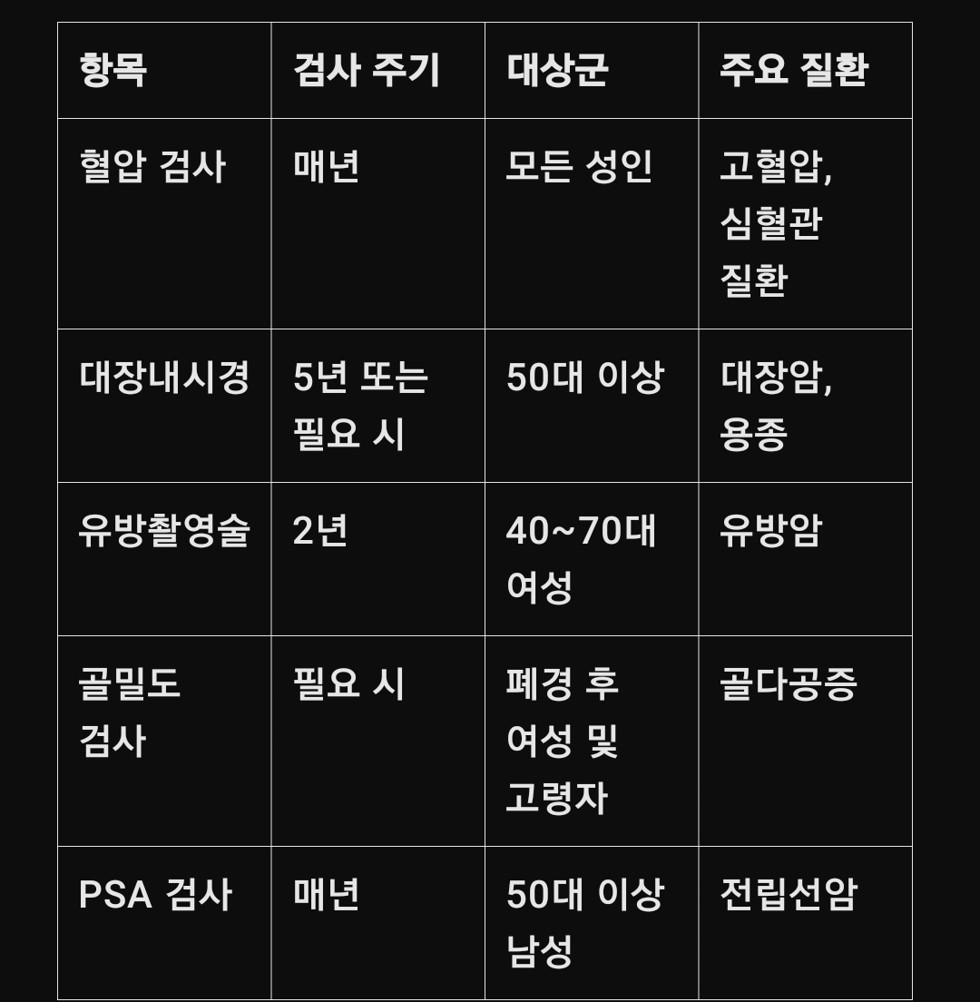 나이와 성별에 따라 권장되는 검진 항목을 통해 자신에게 맞는 관리 방법을 찾을 수 있습니다.