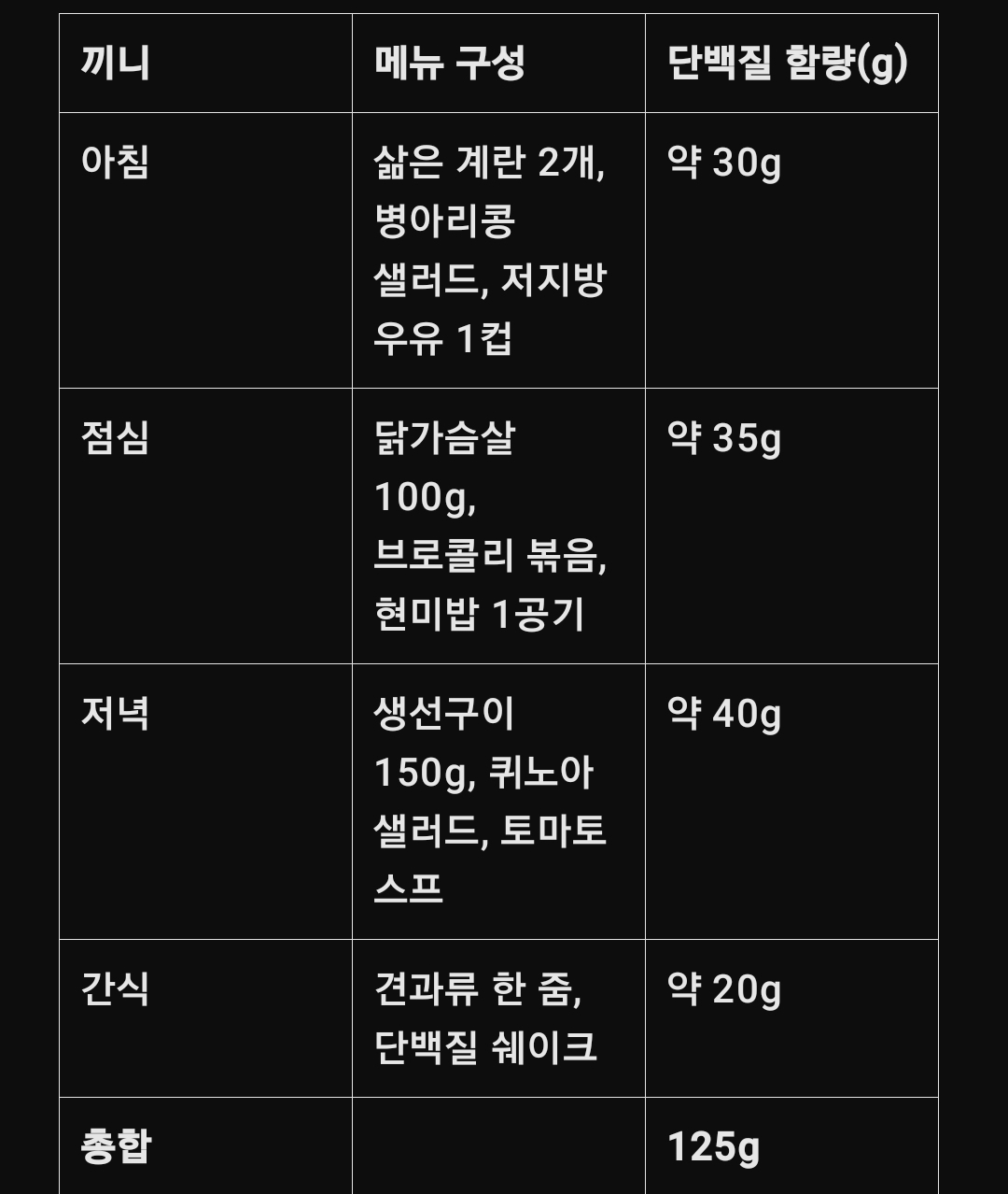 예: 체중 60kg인 사람은 하루 약 72~90g 단백질 필요.