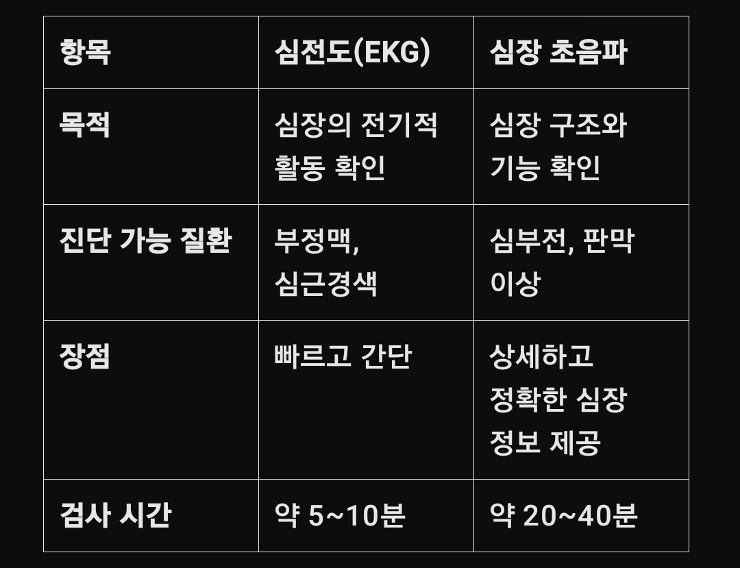 장점: 짧은 검사 시간과 간단한 절차로 심장 상태를 빠르게 파악할 수 있습니다.