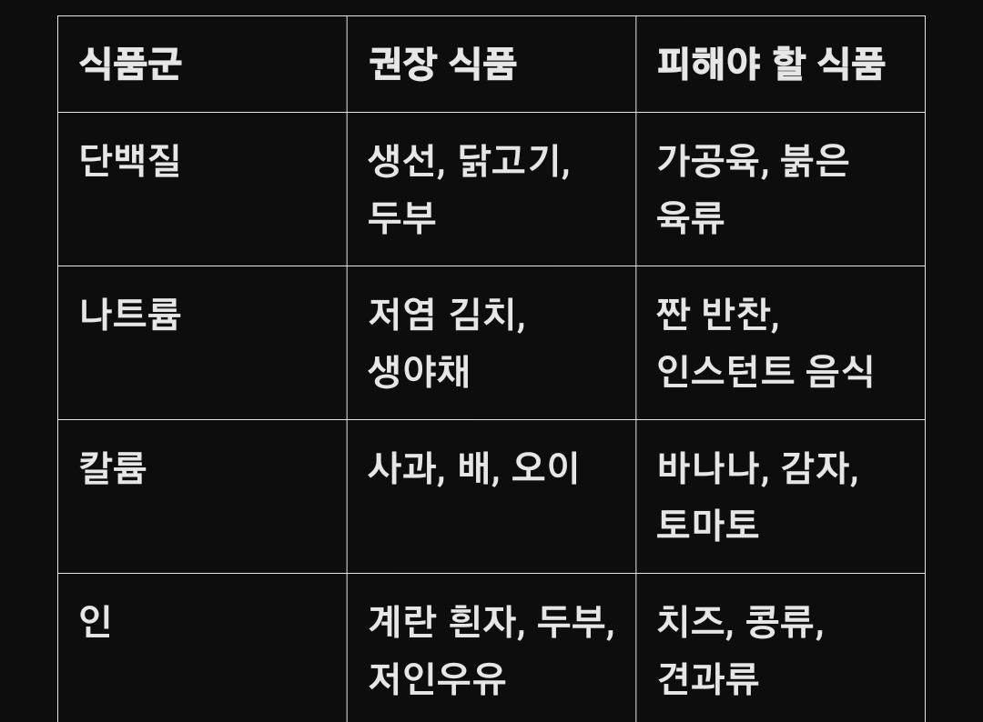 신장 건강을 유지하기 위해서는 적절한 영양 섭취가 중요하다. 특히, 나트륨, 단백질, 인(P), 칼륨(K) 조절이 필요하다.