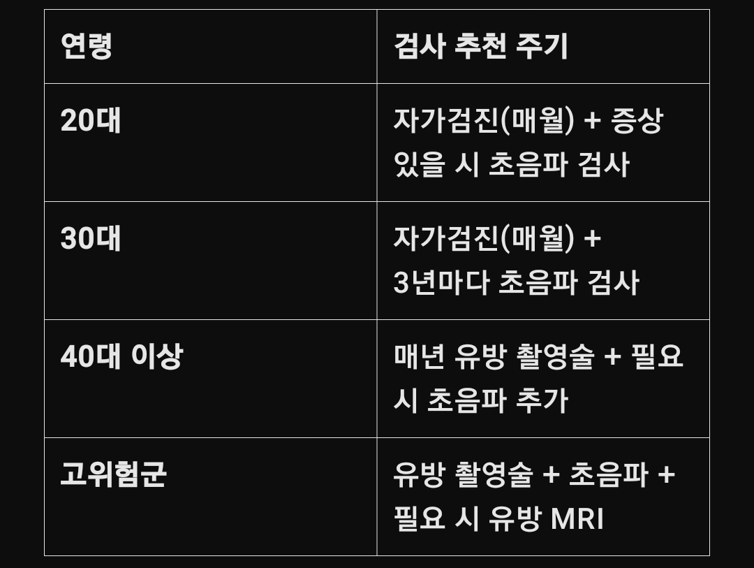 ✅ 고위험군 여성은 필요시 유방 MRI 검사를 병행할 수 있다.