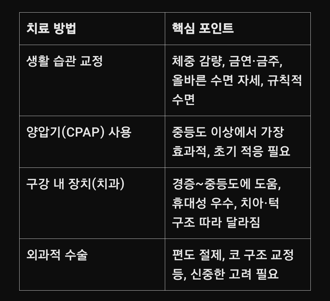 아래는 수면 무호흡증에 대한 대표적인 치료·관리 방법을 간단히 비교한 단 하나의 표이다.