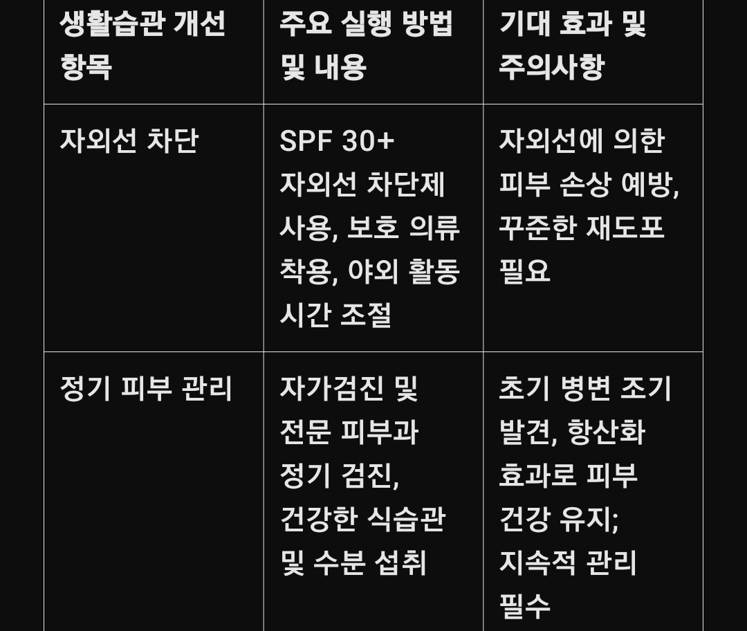 자외선 차단제 및 보호 의류 사용, 정기 검진 등은 지속적이고 꾸준한 실천이 필요하며, 초기 증상이 미약하더라도 정기적인 검진을 게을리하지 않아야 합니다.
