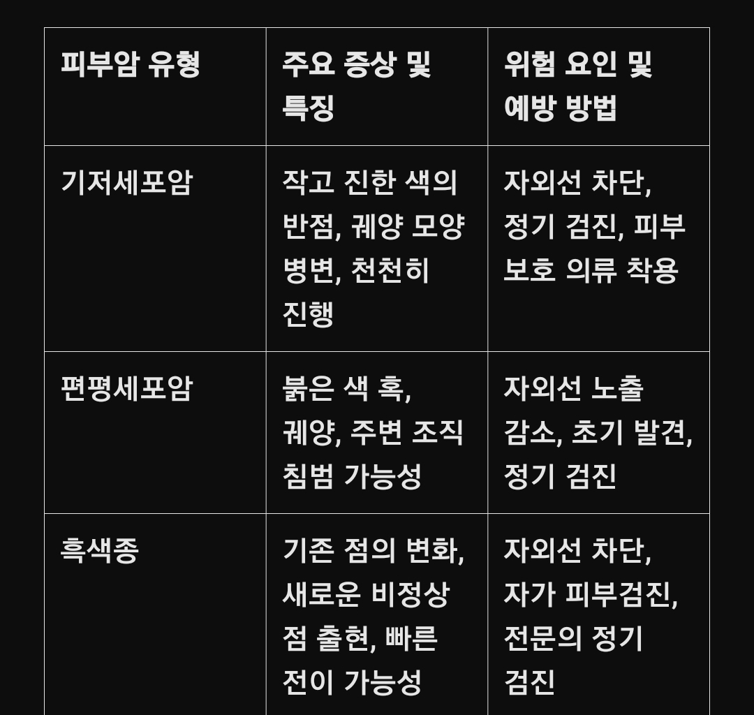 5. 첫 번째 표 – “피부암의 주요 유형 및 특징”