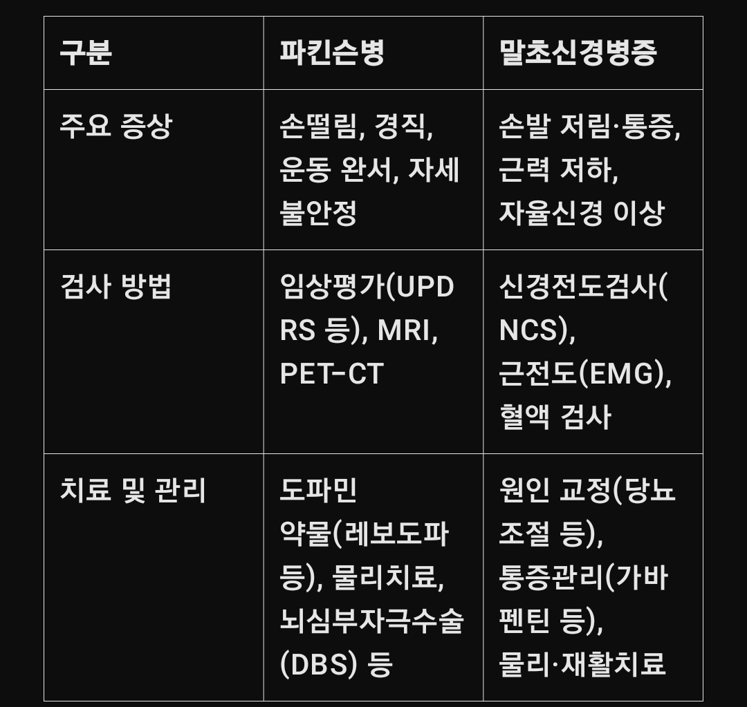 4. 첫 번째 표 – “파킨슨병 vs. 말초신경병증: 주요 증상·검사 비교 요약”