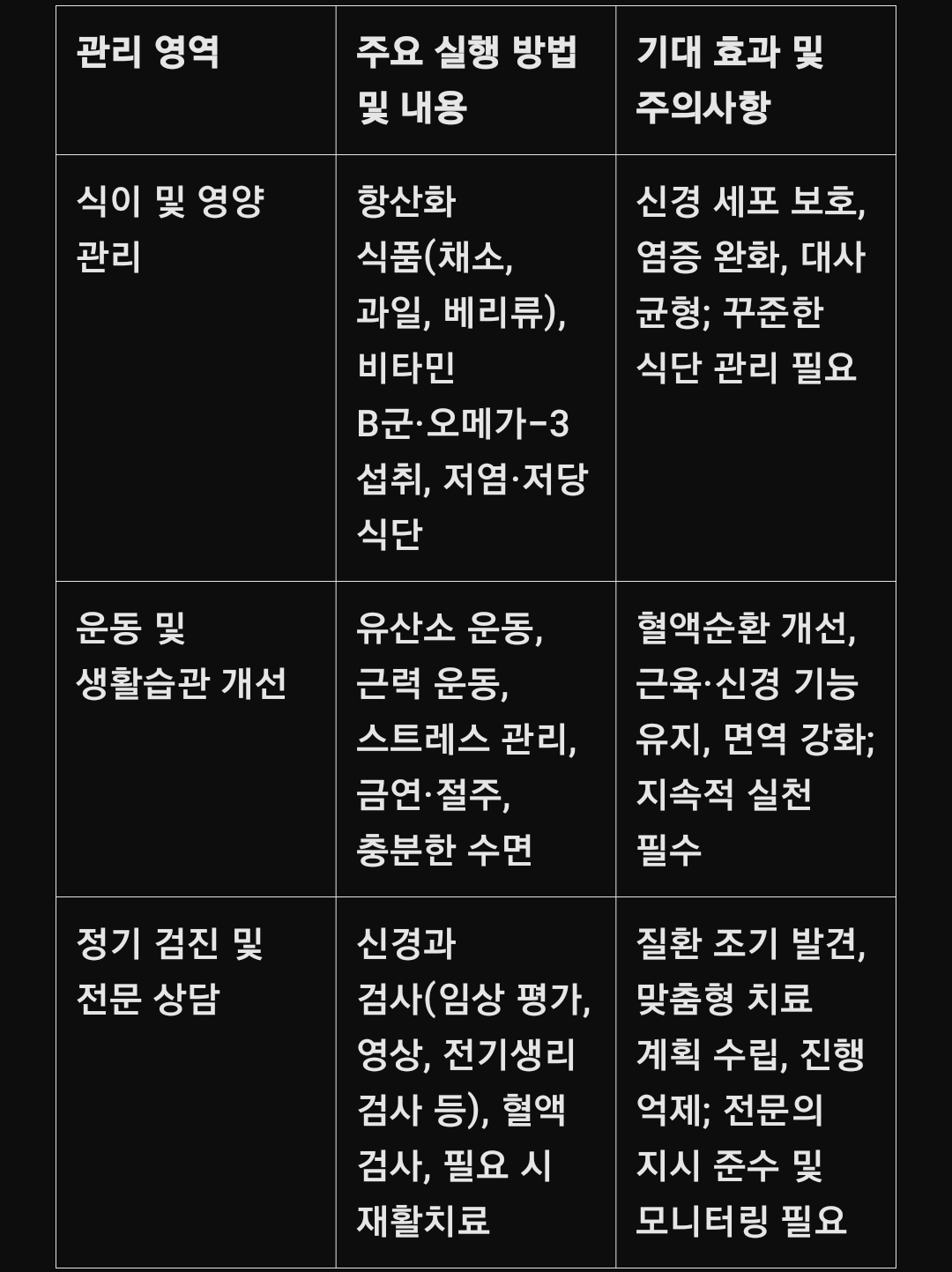 신경계 질환(파킨슨병, 말초신경병증 등)을 조기 발견하고, 생활습관 개선, 식이요법, 운동, 정기 검진을 병행하는 통합적 접근이 필요합니다.