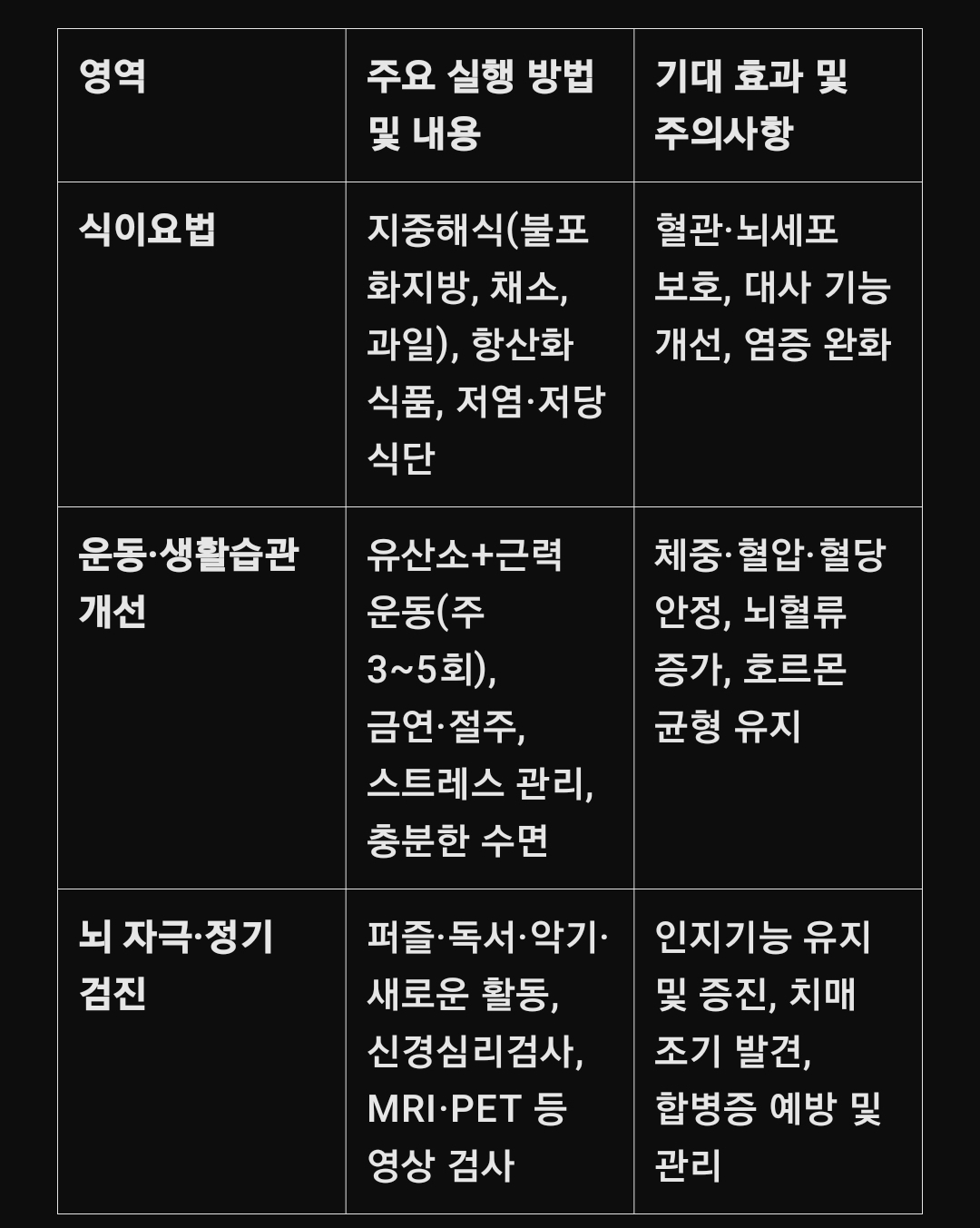 모든 독자분들이 규칙적인 운동, 올바른 식단, 금연·절주, 스트레스 관리, 충분한 수면, 그리고 정기 검진을 통해 치매를 예방하고, 활기차고 건강한 중년과 노년을 영위하시길 진심으로 바랍니다.