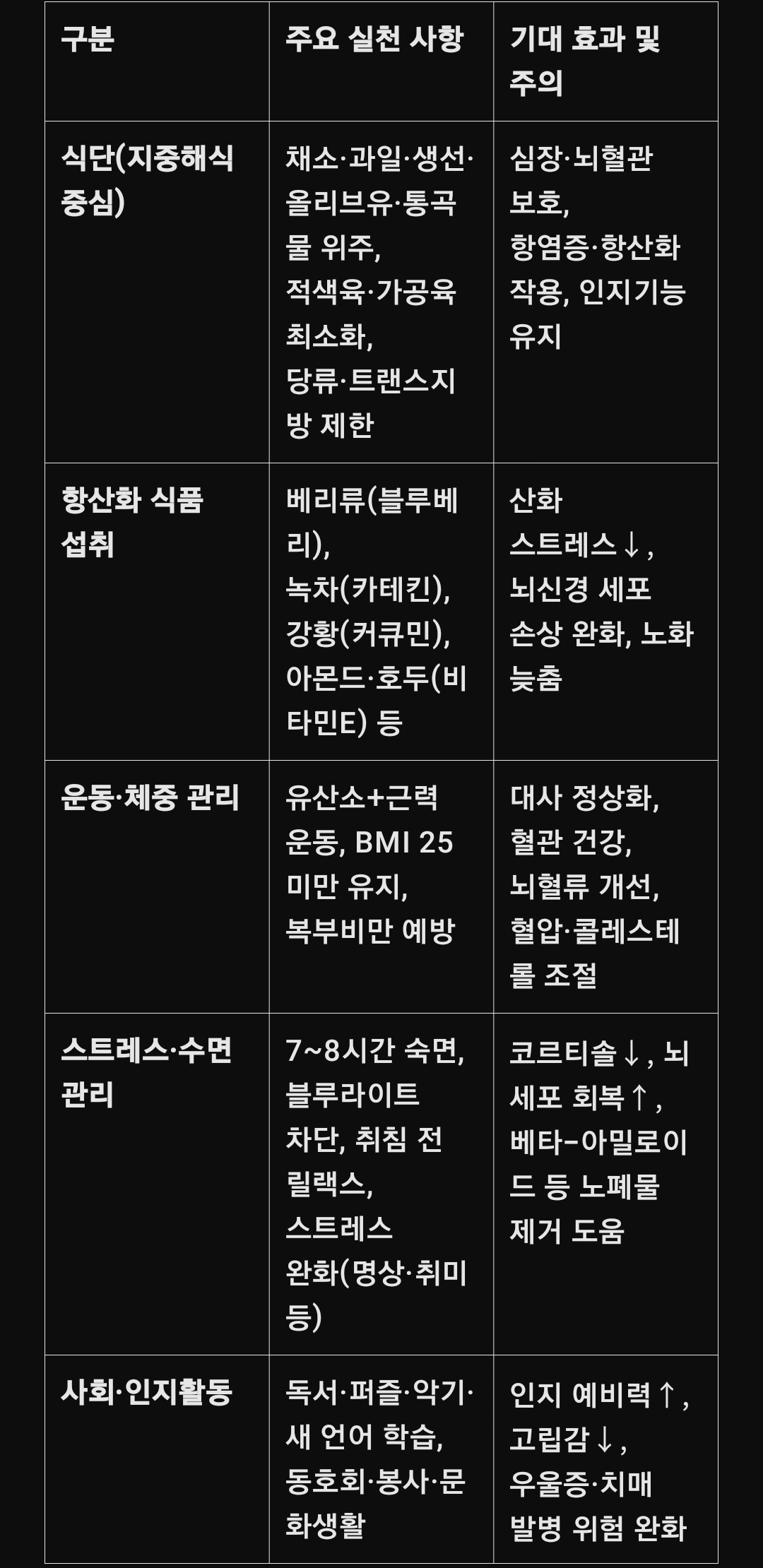4. 치매 예방은 식단 외에도 운동, 금연·절주, 수면, 스트레스 관리, 사회적 교류, 정기 검진 등 다방면 접근이 필수적이므로, 한 가지만으로 성과를 기대하기 어렵습니다.