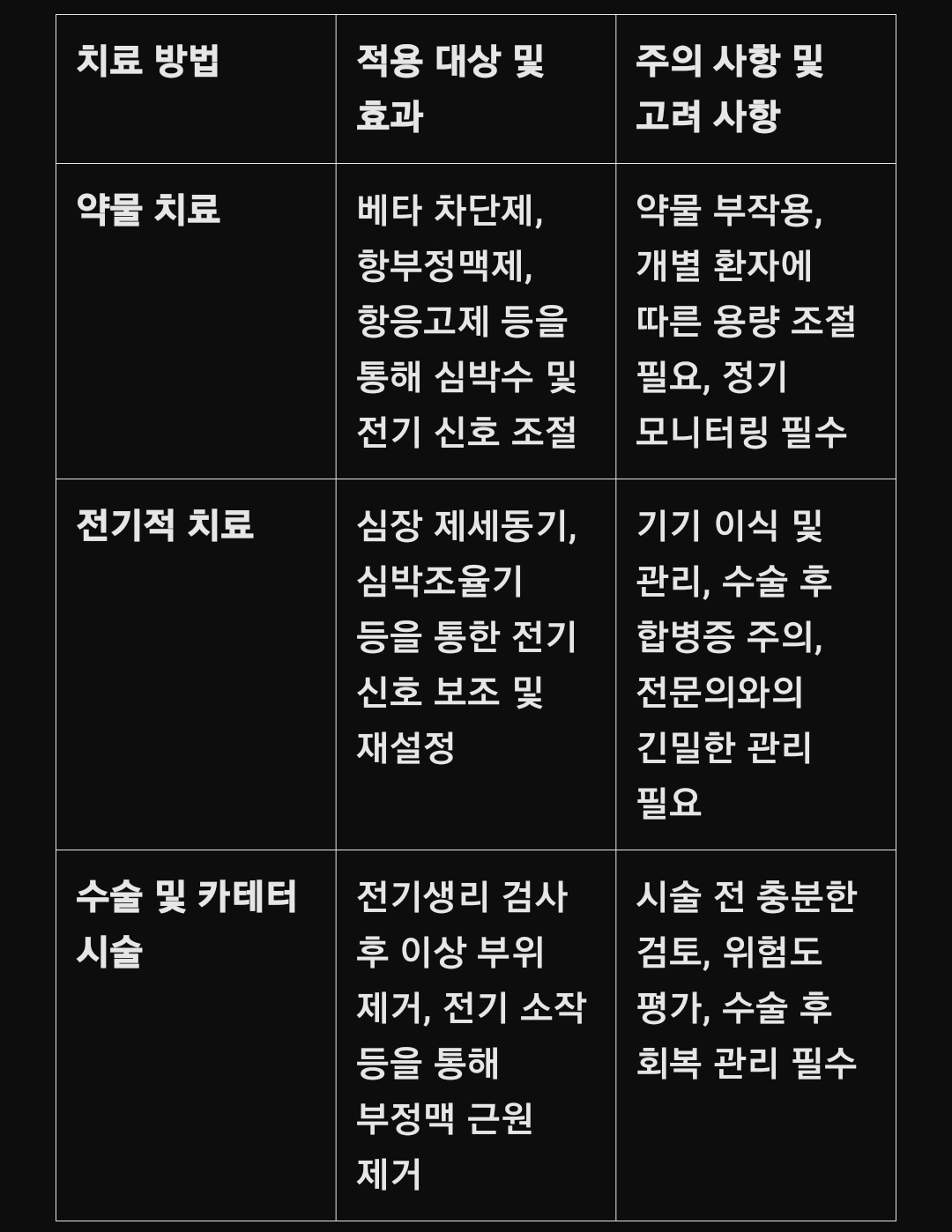 > 주의: 본 문서는 부정맥(심장의 불규칙한 박동)과 관련된 일반적인 의학·건강 정보를 제공하기 위한 것으로, 개인의 건강 상태, 기저 질환, 약물 복용, 생활습관 등에 따라 증상의 원인과 치료 방법은 달라질 수 있습니다. 만약 심계항진, 가슴 두근거림, 어지럼, 실신 등의 증상이 지속되거나 심해진다면, 반드시 전문의(심장내과, 전기생리학과 등)와 상담하여 정밀 검사 및 맞춤형 치료를 받으시기 바랍니다.