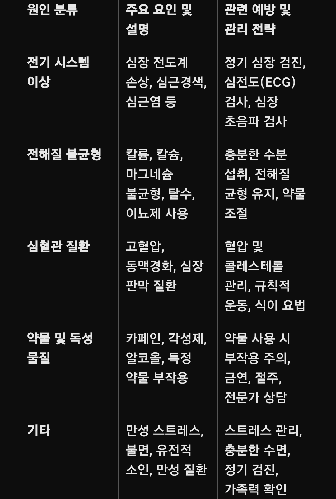 부정맥은 심장의 전기적 불안정으로 인해 발생하는 질환으로, 그 원인은 심장 전도계 이상, 전해질 불균형, 기저 심혈관 질환, 약물 부작용, 스트레스 등 매우 다양합니다. 초기에는 증상이 경미할 수 있으나, 진행될 경우 심각한 합병증을 초래할 수 있으므로, 조기 진단과 적절한 치료, 그리고 생활습관 개선이 필수적입니다.