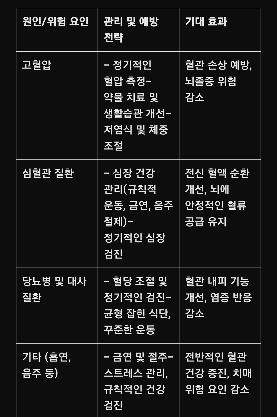 아래 표는 혈관성 치매 예방을 위한 주요 원인별 관리 및 예방 전략을 정리한 내용입니다.