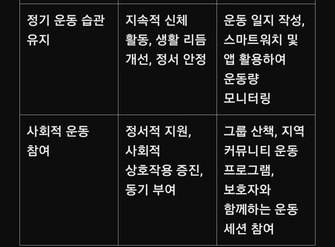 치매 환자와 보호자가 함께 참여할 수 있는 지역사회 운동 프로그램과 지원 네트워크 구축이 필요하며, 이를 통해 환자들의 지속적인 운동 참여와 정서적 안정이 이루어져야 한다. 이러한 연구와 제도 개선을 통해 치매 환자의 운동 관리가 체계적으로 이루어지면, 치매 진행을 효과적으로 늦추고 전반적인 삶의 질을 향상하는 데 큰 기여를 할 수 있을 것이다.