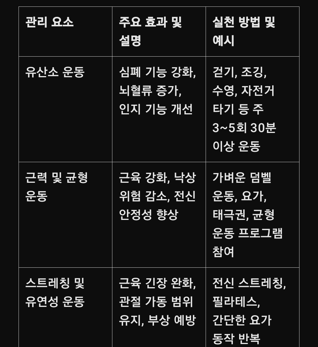 • 유산소 운동, 근력 운동, 균형 운동, 유연성 운동을 모두 포함하는 복합 프로그램을 구성한다.