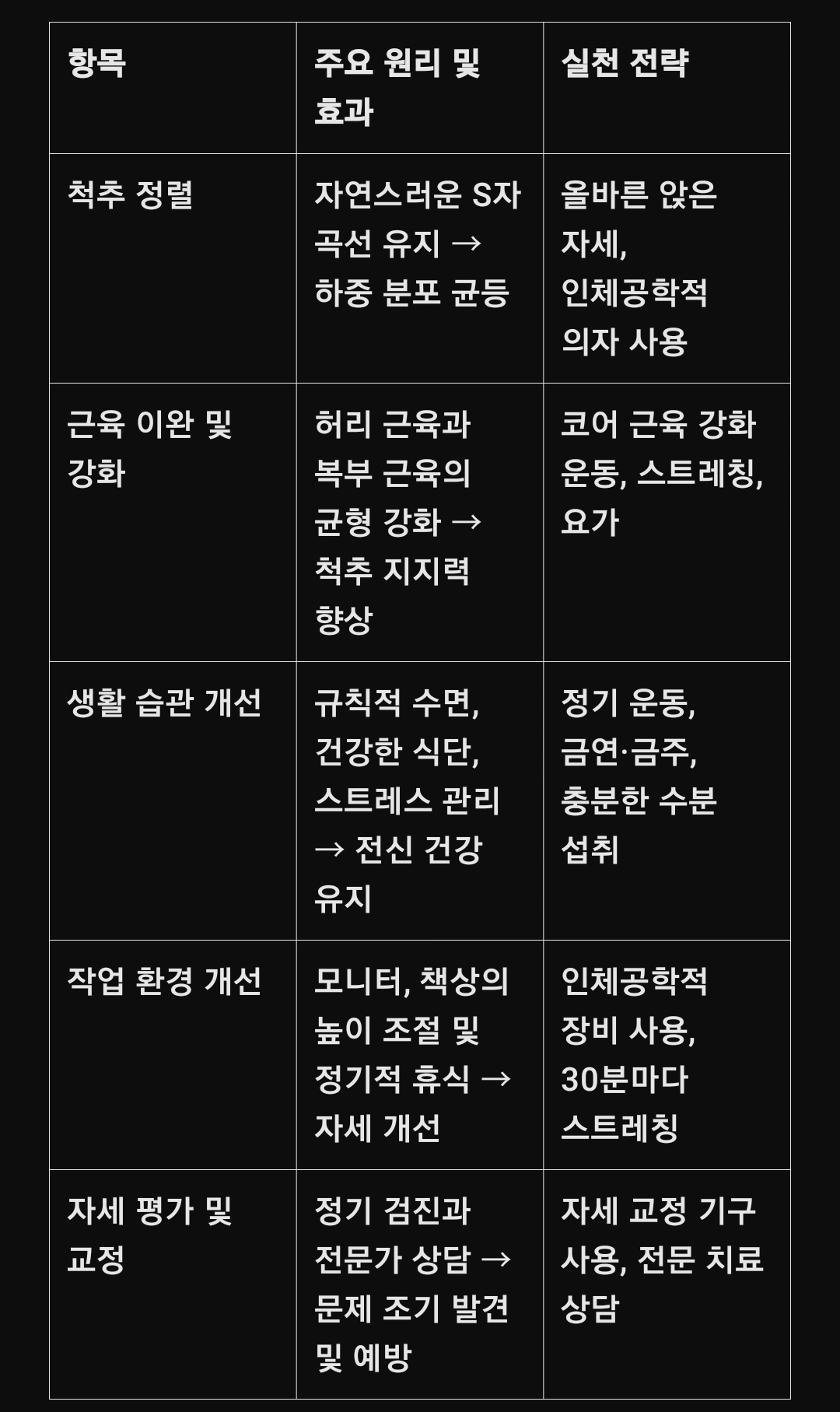 A: 정기적인 자세 점검, 올바른 앉은 자세와 서 있는 자세 유지, 그리고 규칙적인 스트레칭과 운동이 필수적입니다.