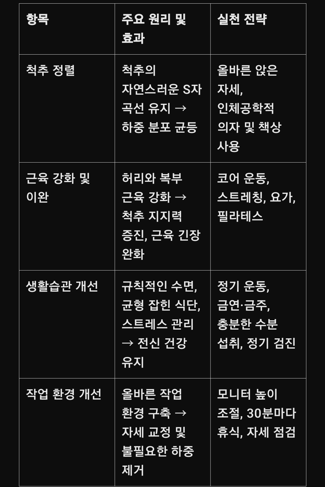 A: 가장 중요한 것은 올바른 자세를 유지하고, 인체공학적으로 설계된 의자와 책상을 사용하는 것입니다. 또한, 30분마다 일어나서 스트레칭을 하는 습관도 매우 중요합니다.