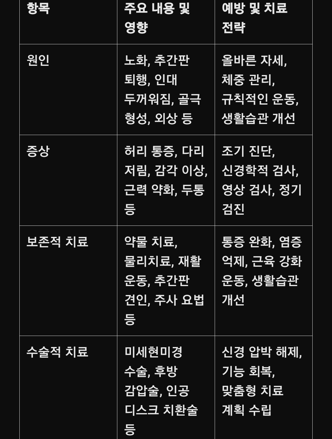(표 형식 – 척추협착증의 원인, 증상, 치료법 및 예방 전략 요약)