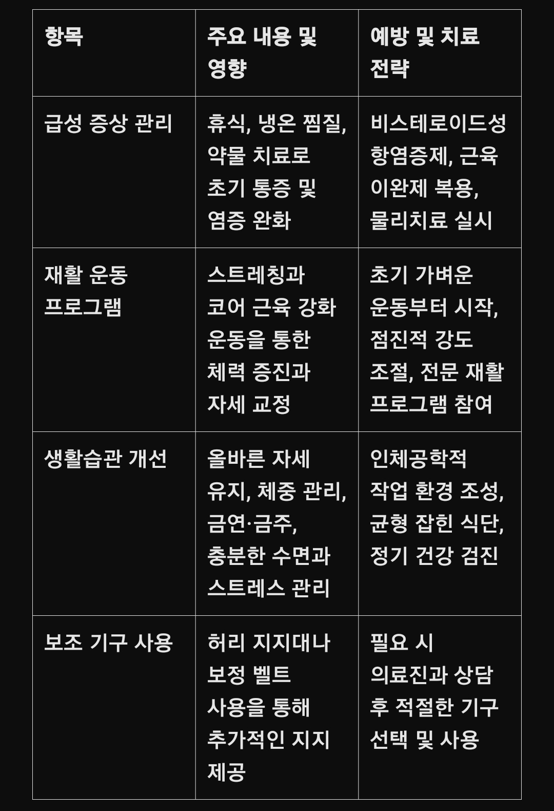 (표 형식 – 요추 염좌 치료 및 예방 전략 요약)