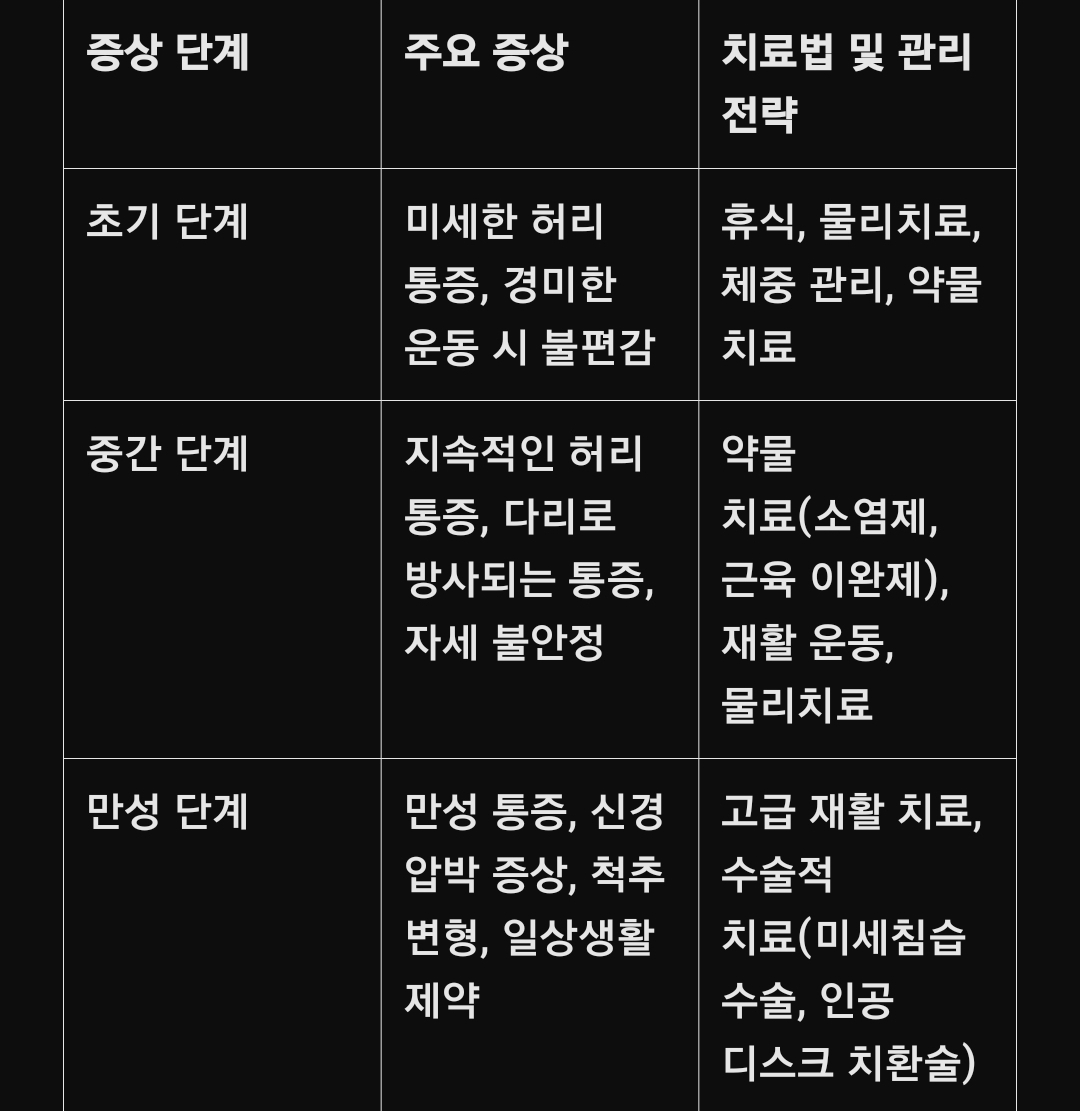 이 표는 퇴행성 디스크의 증상 진행 단계와 각 단계에서 적용 가능한 치료법 및 관리 전략을 한눈에 파악할 수 있도록 정리한 자료입니다.