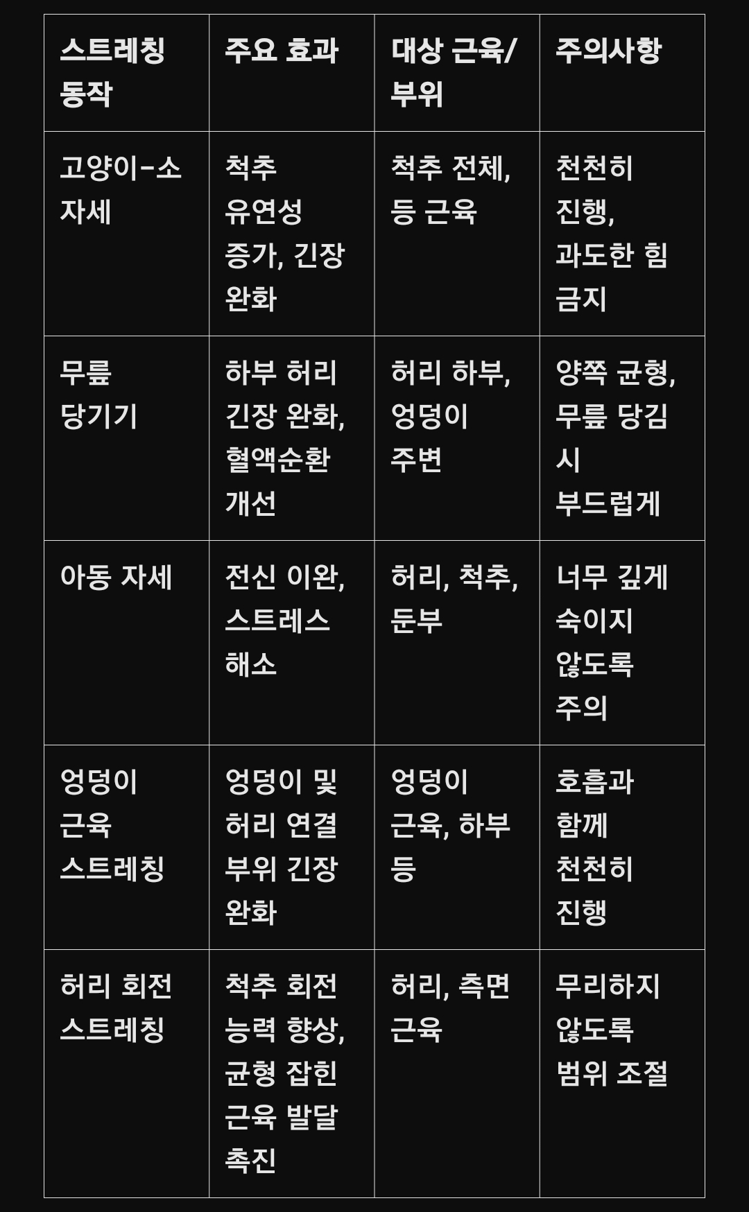 열두 번째 문단은 다섯 가지 스트레칭 동작의 효과와 장점을 표로 요약하여 독자분들께 한눈에 쉽게 이해하실 수 있도록 정리합니다. 아래 표는 각 동작의 주요 효과, 대상 근육 및 적용 시 주의사항을 간략하게 정리한 것입니다.