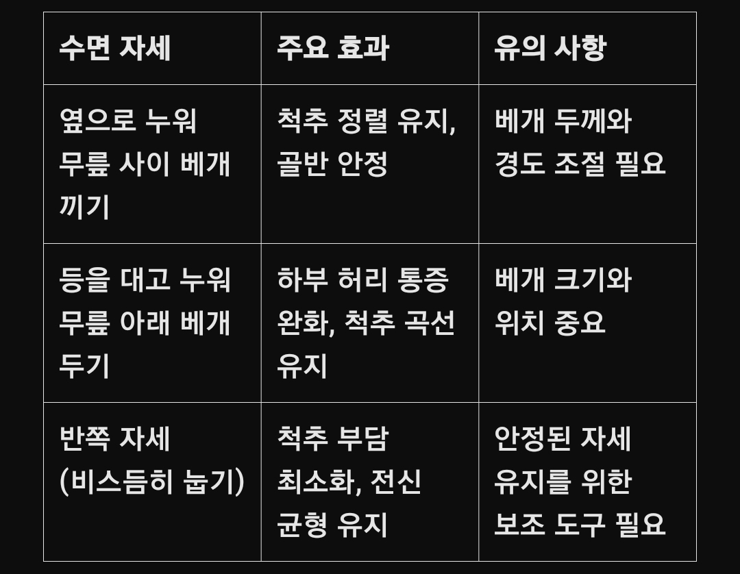 이상으로, 허리 통증을 줄이기 위한 수면 자세와