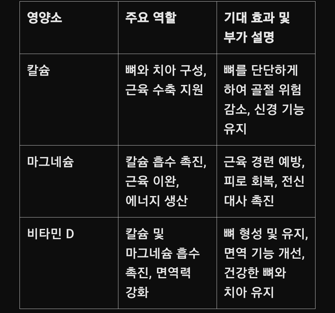 아래 표는 칼슘, 마그네슘, 비타민 D의 주요 역할과 기대 효과를 한눈에 정리한 것입니다.