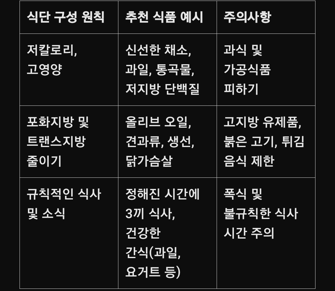 저칼로리, 저염식, 균형 잡힌 영양소 섭취가 필수적입니다.