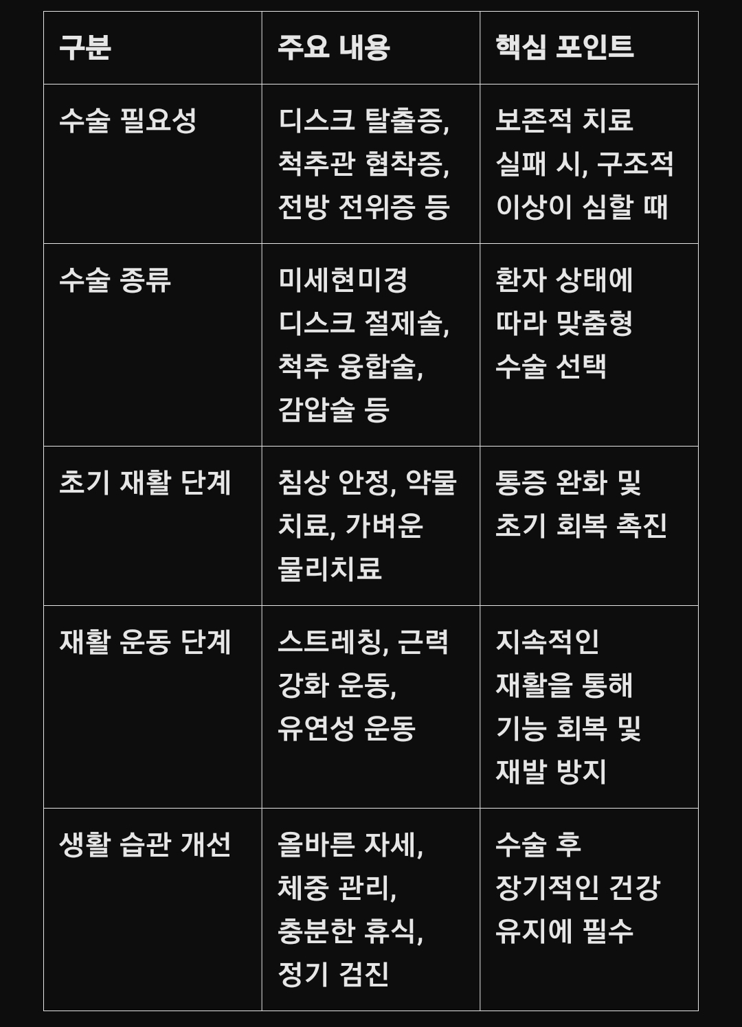 아래는 허리 수술이 필요한 경우와 수술 후 재활 관리법