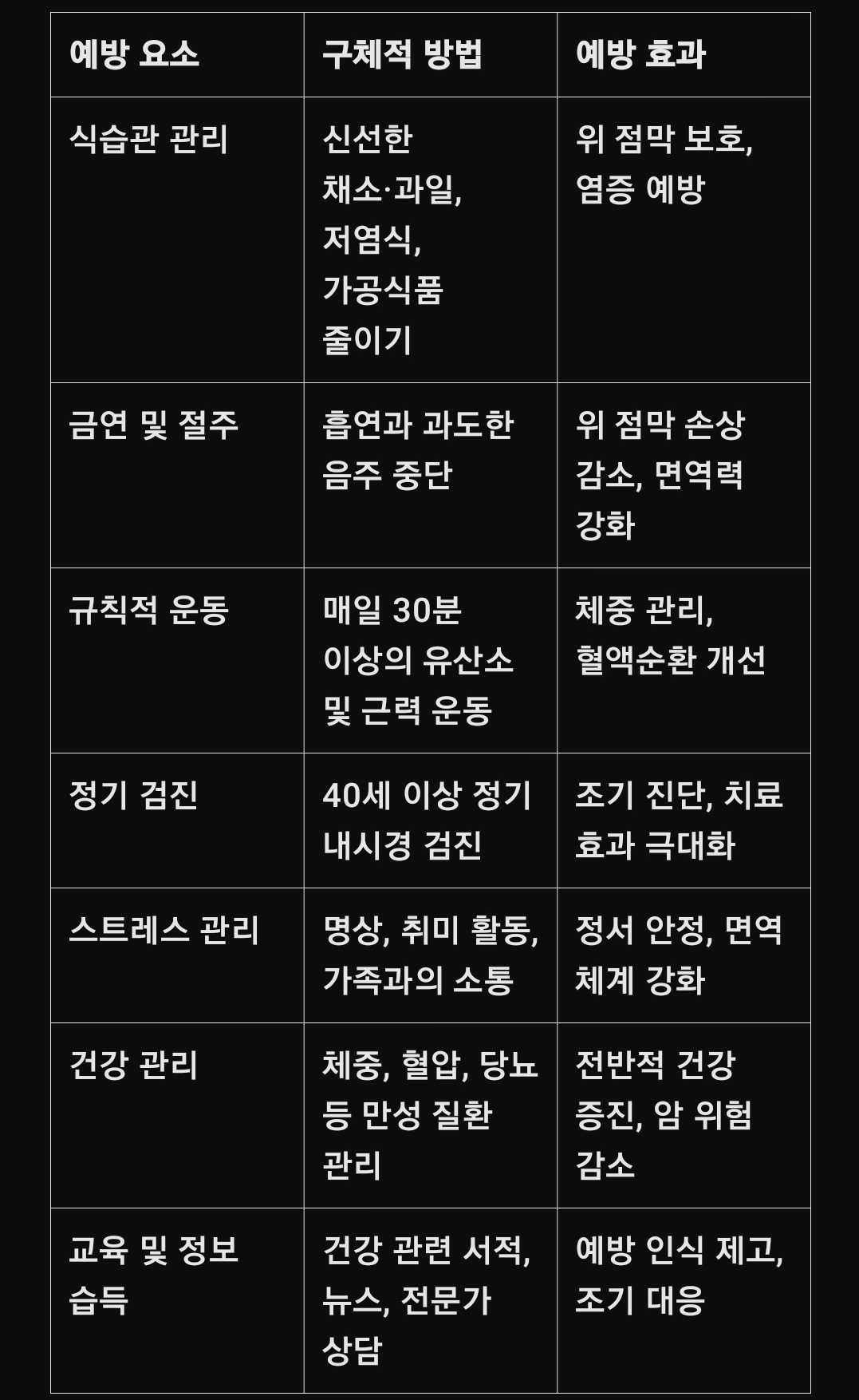 위암 예방은 건강한 생활 습관을 유지하고, 정기 검진을 통해 조기 발견하는 것이 핵심입니다.