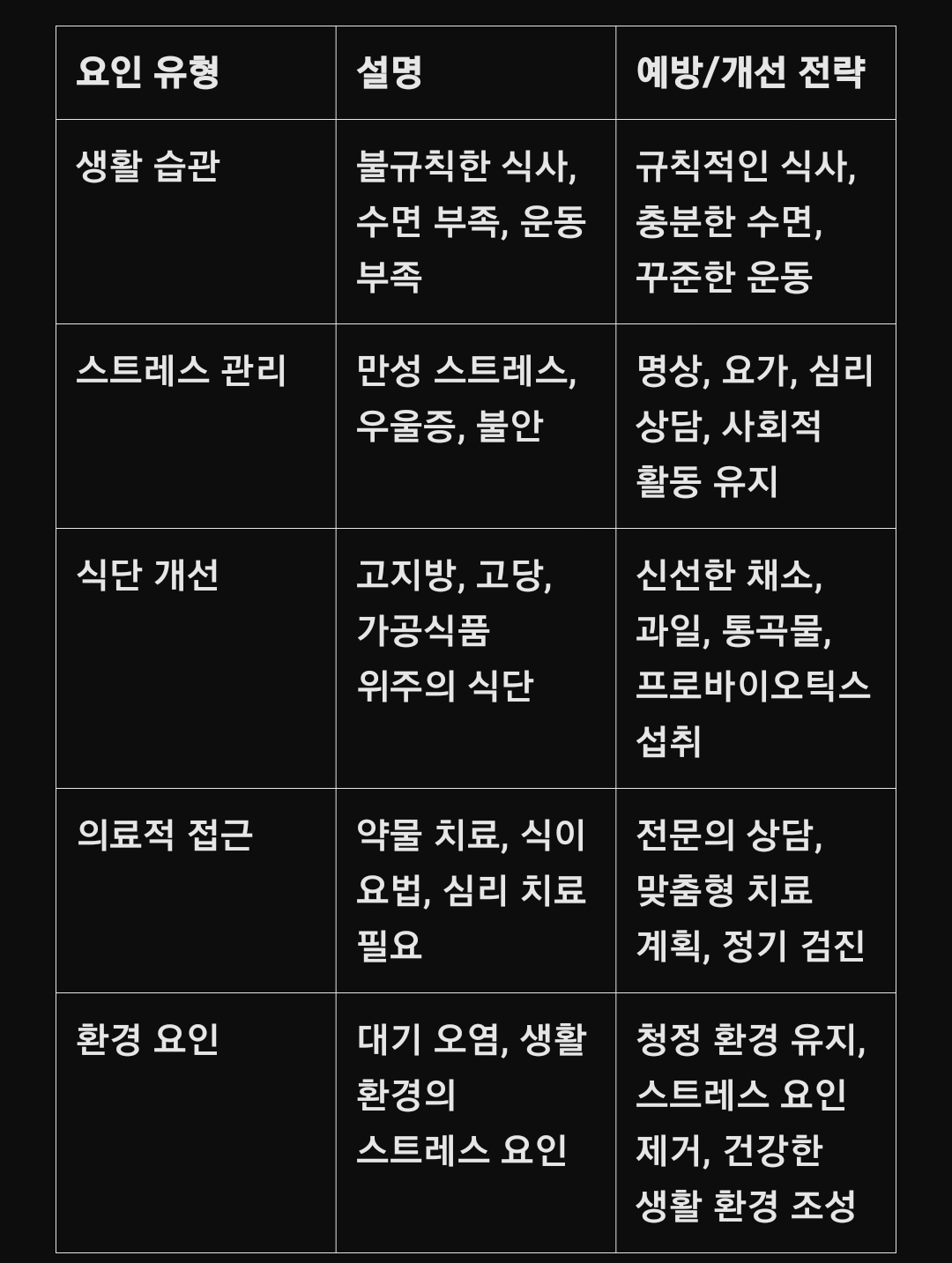 불규칙한 식습관, 만성 스트레스, 운동 부족, 그리고 장내 미생물 불균형 등 다양한 요인에 의해 발생합니다.