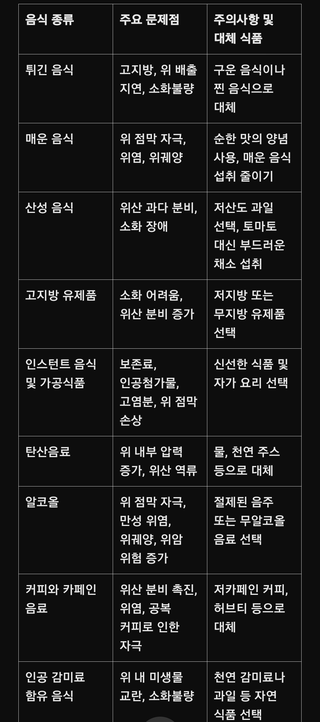 아래 표는 위 건강을 해치는 대표적인 10가지 음식과 각 음식이 유발할 수 있는 주요 문제점을 한눈에 정리한 것입니다.