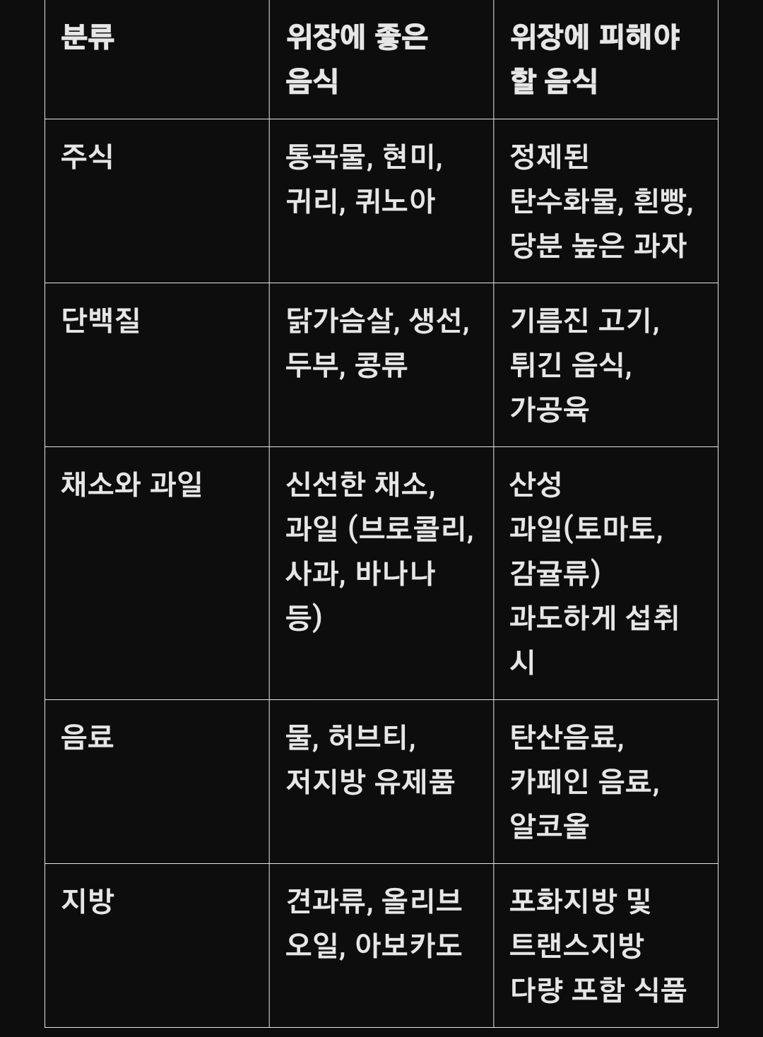 간단한 표: 위장에 좋은 음식 vs. 피해야 할 음식
