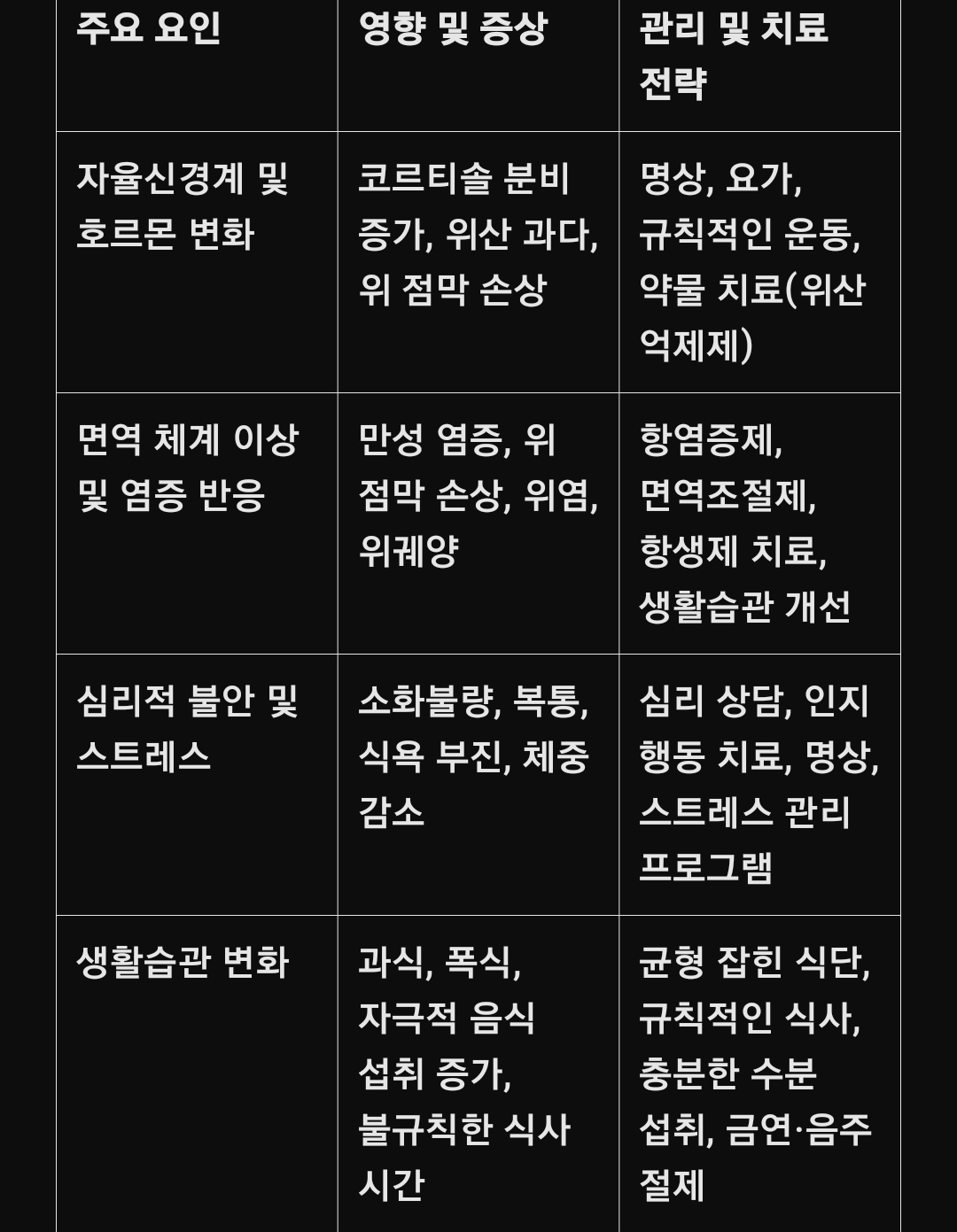 아래 표는 스트레스가 위장 질환에 미치는 영향과 이를 관리하기 위한 주요 전략들을 요약한 것입니다.